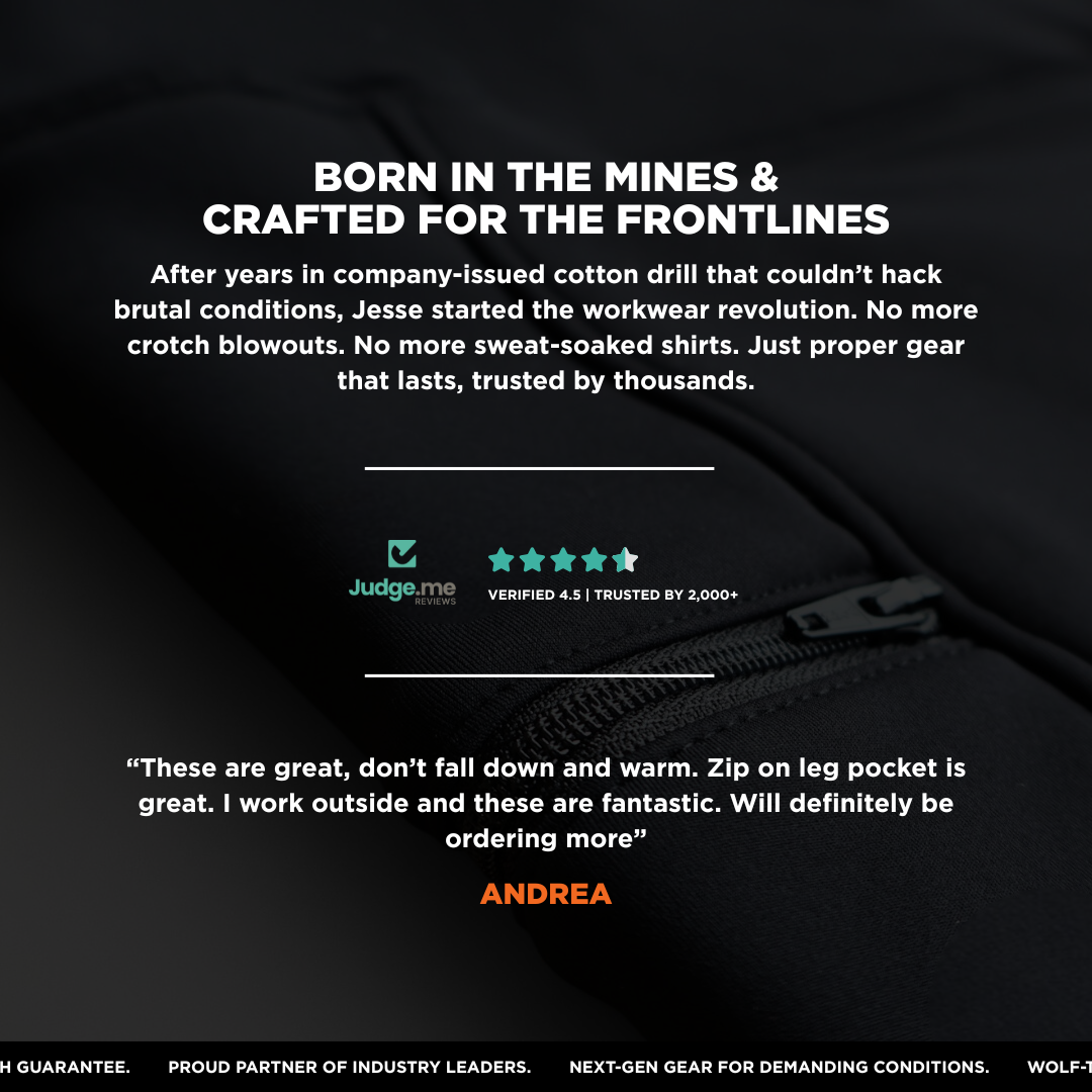 "Top quality workwear, built to handle whatever the day throws at you. Super comfortable, no stiff fabric or cheap stitching. After weeks on site and in the wash, they still look brand new.