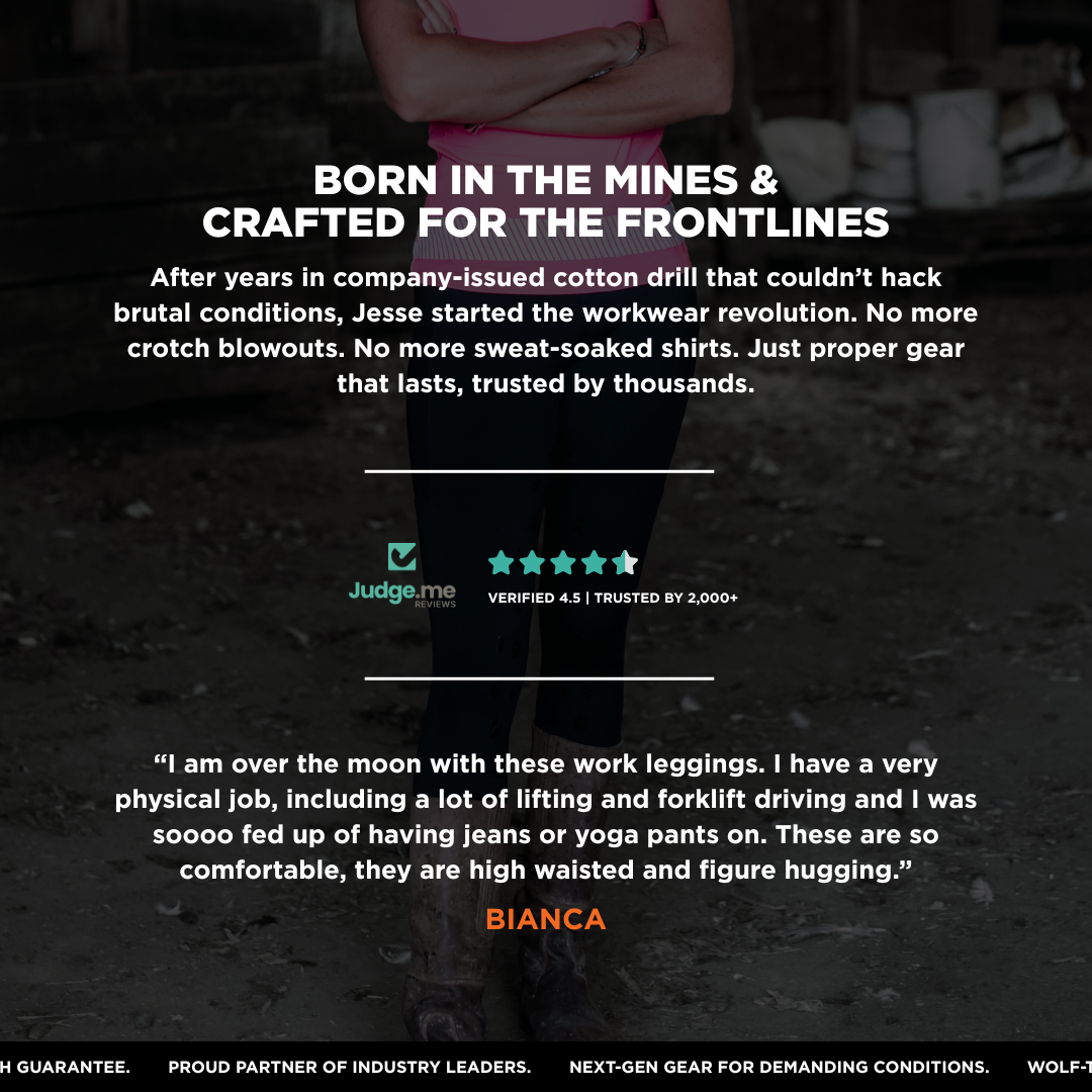 THE WORLD'S MOST COMFORTABLE WORKWEAR ★★★★★ TRUSTED BY 2,000+ CUSTOMERS WOLF TOUGH GUARANTEE