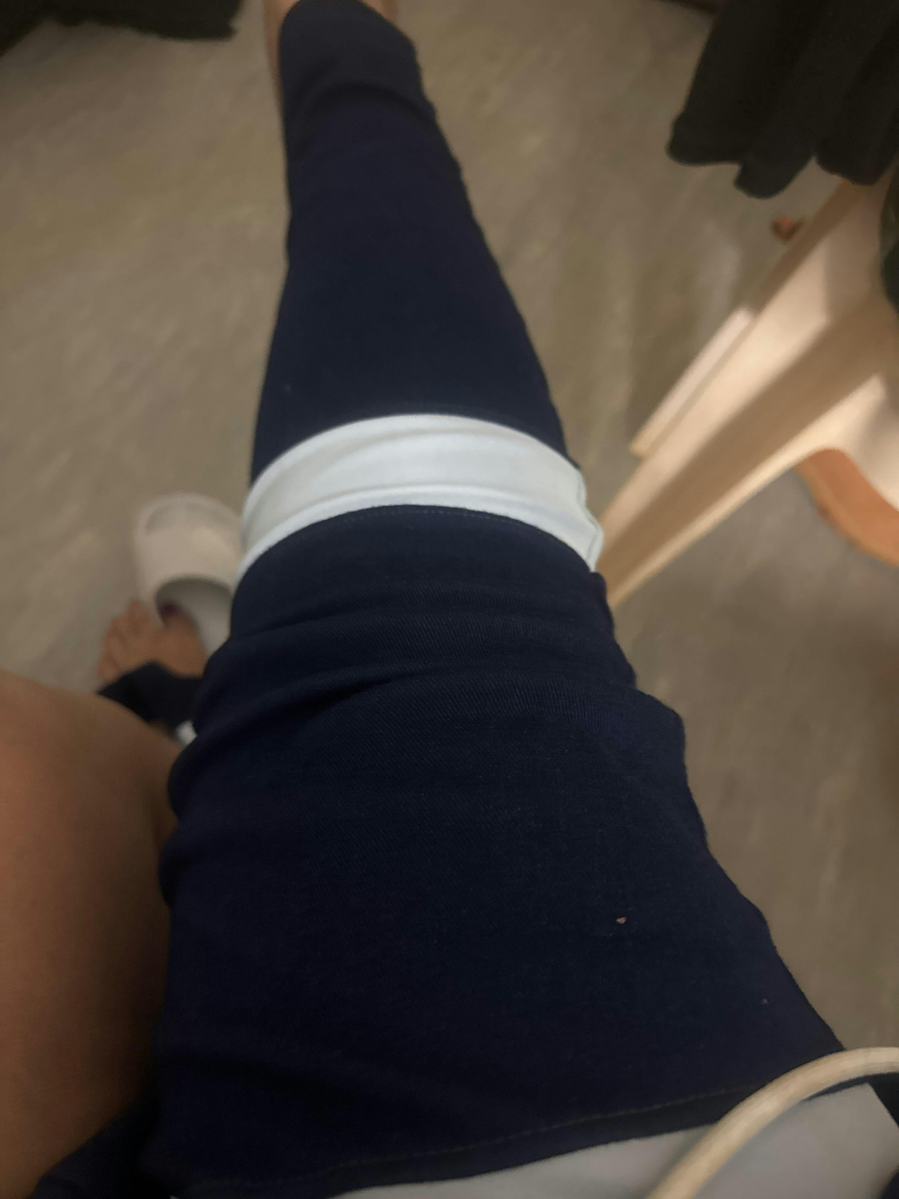 Clean navy denim style with stretchy reflective safety strips